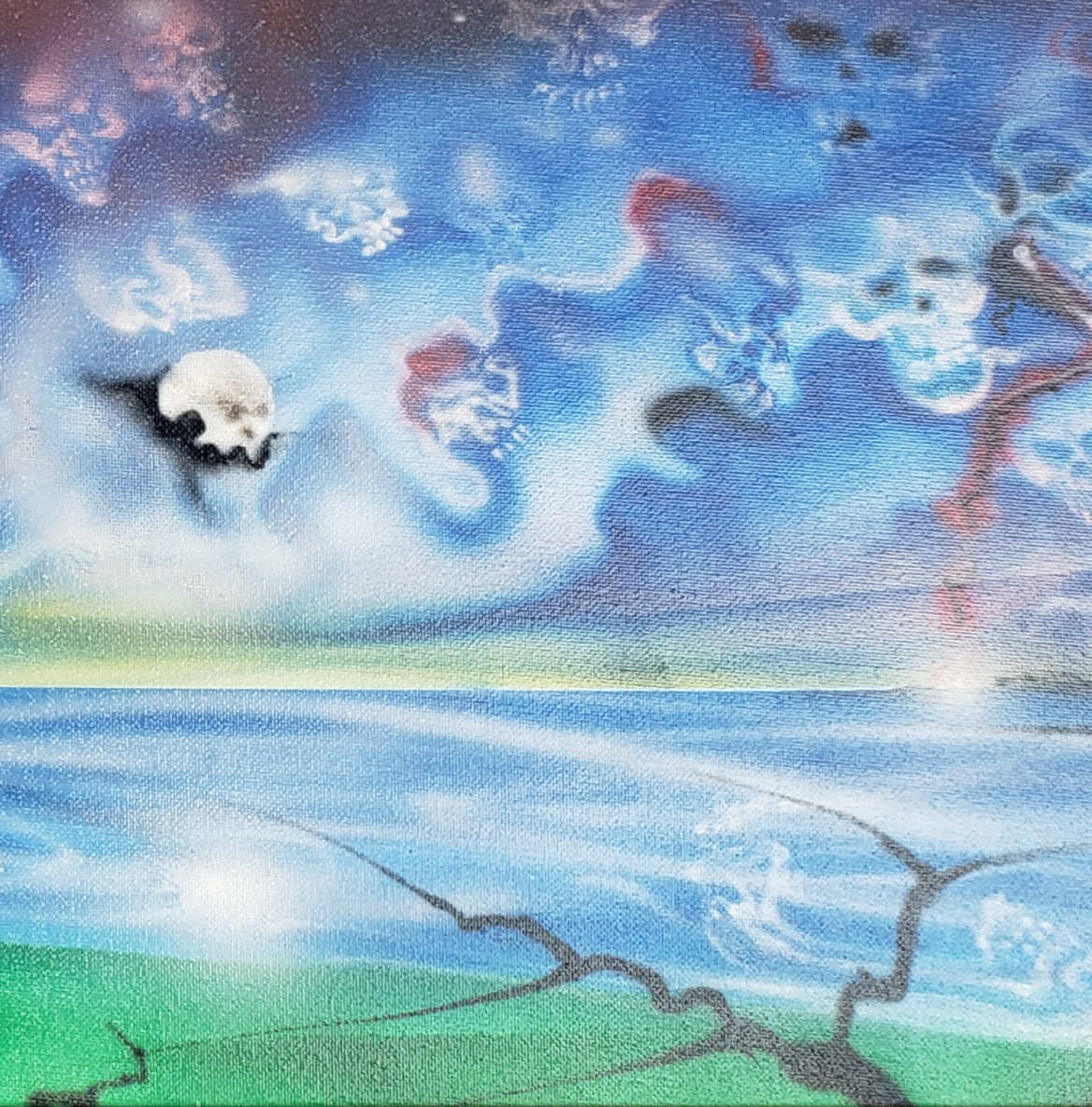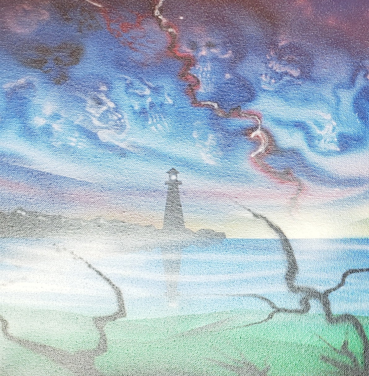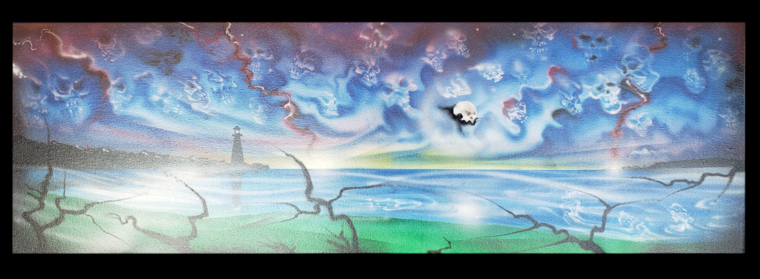 This freehand airbrush piece captures a dark, gothic image of the Bay of Fundy while juxta positioning a spirit-skull theme in the clouds and water. The storm is rolling in and the lighthouse is dim. Inspired by skulls and lighthouses, this unique artwork was created during the 2023 Wharf Rat Rally, in Digby Nova Scotia. As one person described the piece, “It would look great behind a bottle of whisky in my bar”. Painted by Randy Horton, 2023